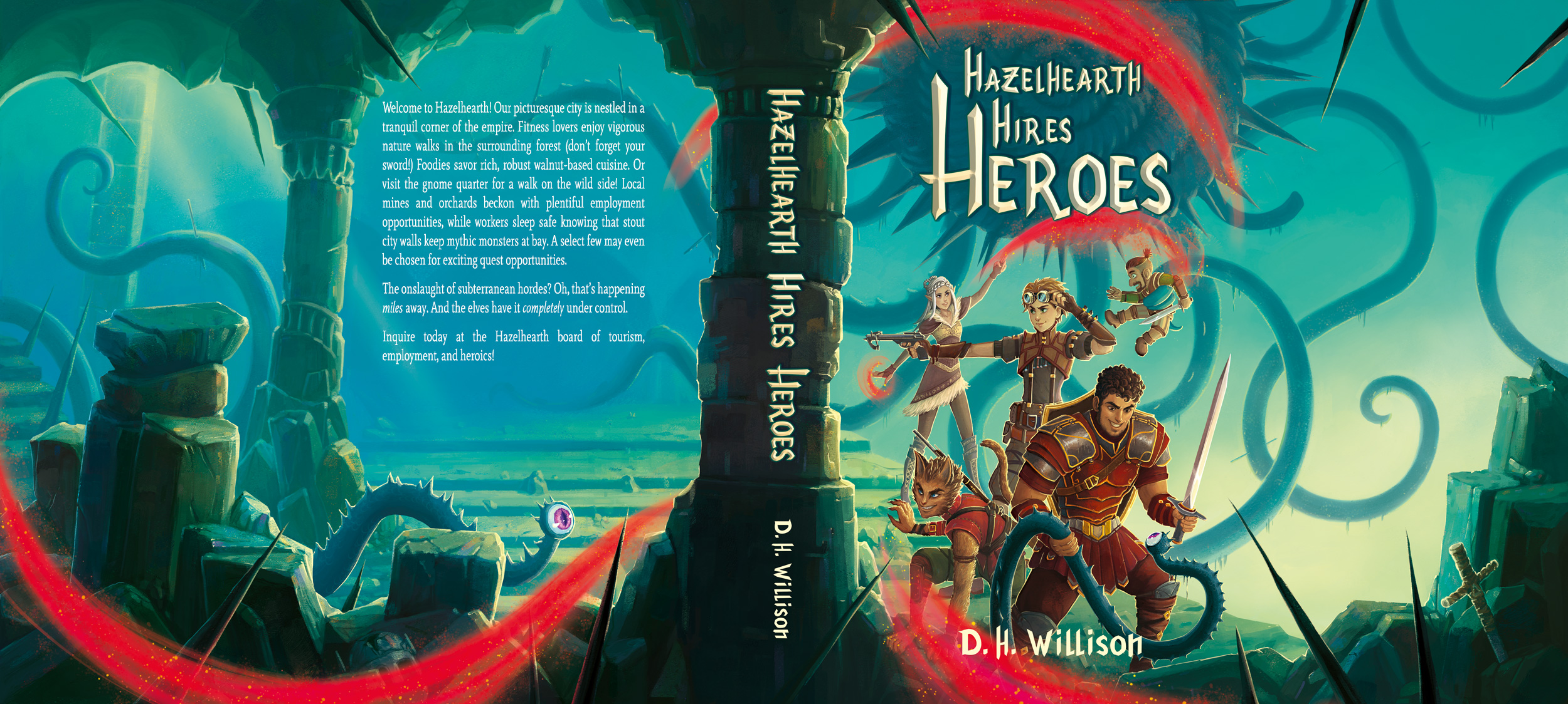With the cover of Hazelhearth Hires Heroes now public, I thought I’d share a few more images and a bit about the process. I’m a fan of huge fantasy panoramas, so even though hardcover books aren’t big sellers these days, I’ll always jump at the chance to have a masterpiece created. In this case, you’ll only ever see this lovely sunken temple panorama with the hardcover laid out flat. So I thought I’d share it in all its glory: